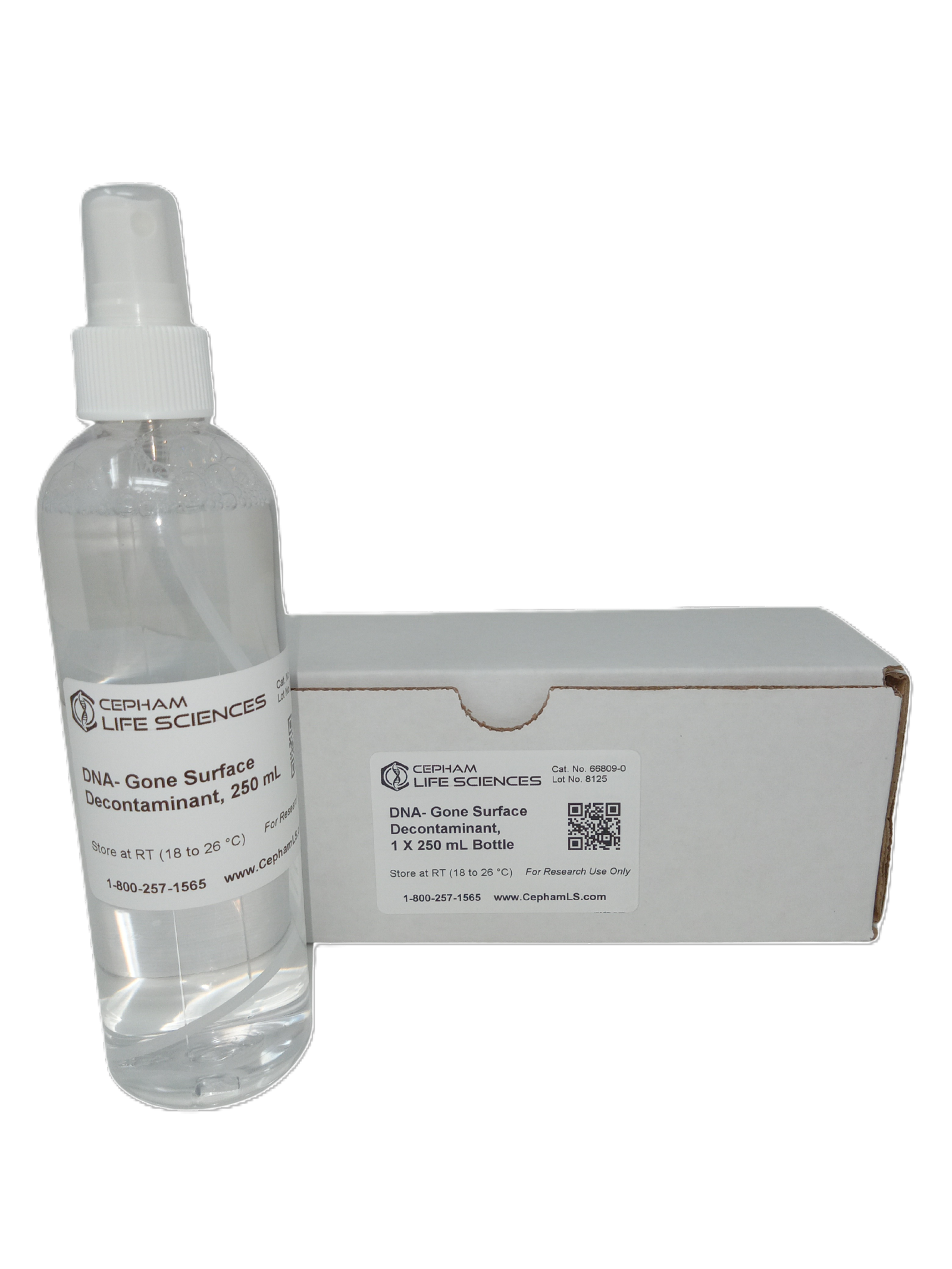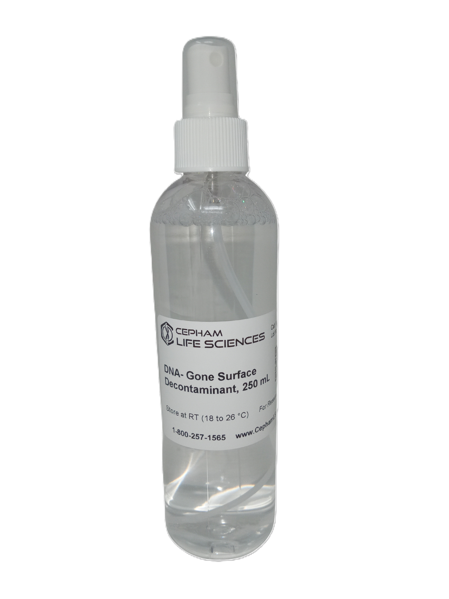 DNA-Gone Decontaminant is available in different sizes as spray bottles: 250 mL, 500 mL, 1 L, 4 x 250 mL, 2 x 500 mL and 1 GAL Refill Pack (without spray head).